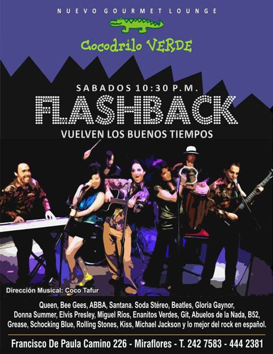 El grupo musical FLASHBACK se formó en Marzo del 2003 bajo la dirección de Coco Tafur, quien reunió a cantantes y músicos peruanos de varias generaciones para interpretar lo mejor de la música de los 60s 70s 80s y 90s. VUELVEN LOS BUENOS TIEMPOS es el nombre que le dio al show y en él desfilan las mejores canciones de esas inolvidables décadas.